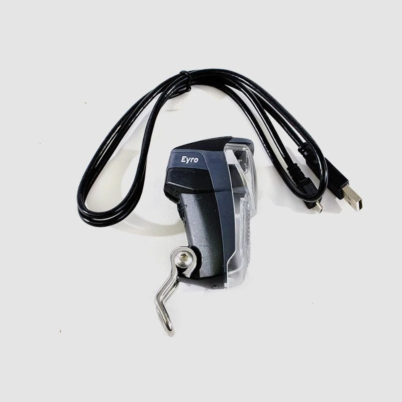 Die „Lumotec IQ EYRO“ Akkulampe von Busch & Müller wurde extra für Elektroräder konzipiert. Mit den 2 Leuchtstufen kann die Lichtstärke und Akkulaufzeit nach Wunsch geändert werden. Im gedrosselten Modus leuchtet die Eyro Lampe bis zu 15 Stunden. Nachdem der LED Leuchter an der Gabel montiert wurde, kann die Licht/Akku – Einheit jederzeit aus der Befestigung entnommen und über die Micro USB Buchse aufgeladen werden.
