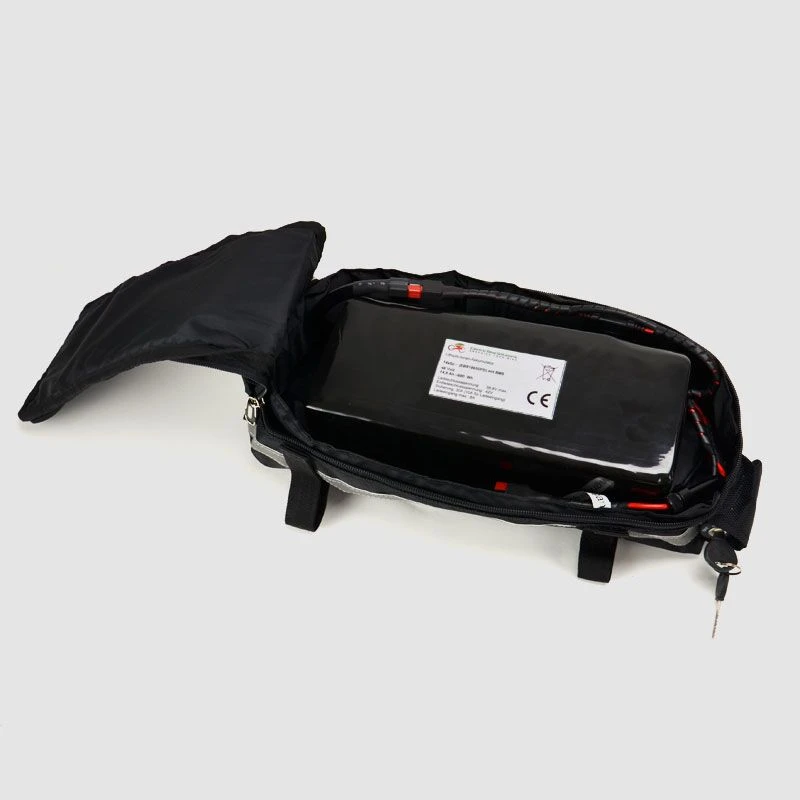 Diese robuste Akkutasche wird auf den GepĂ€cktrĂ€ger geschnallt. Die Stromzufuhr vom Akku kann mittels des eingenĂ€hten SchlĂŒsselschalters von auĂen bequem an- und ausgeschaltet werden. Innen befinden sich herausnehmbare Polster zum Schutz des Akkus.